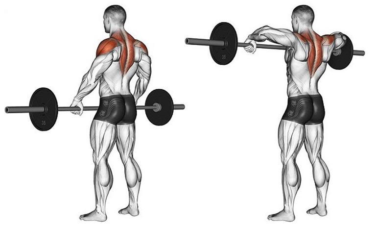 С точки зрения анатомии, это движение считается одним из наиболее правильных. Тяга штанги намного безопаснее, чем более популярный армейский жим и тем более жим из-за головы сидя, который выполняется в тренажере Смита.