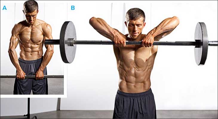 Правильная техника тяги штанги к подбородку выглядит следующим образом: