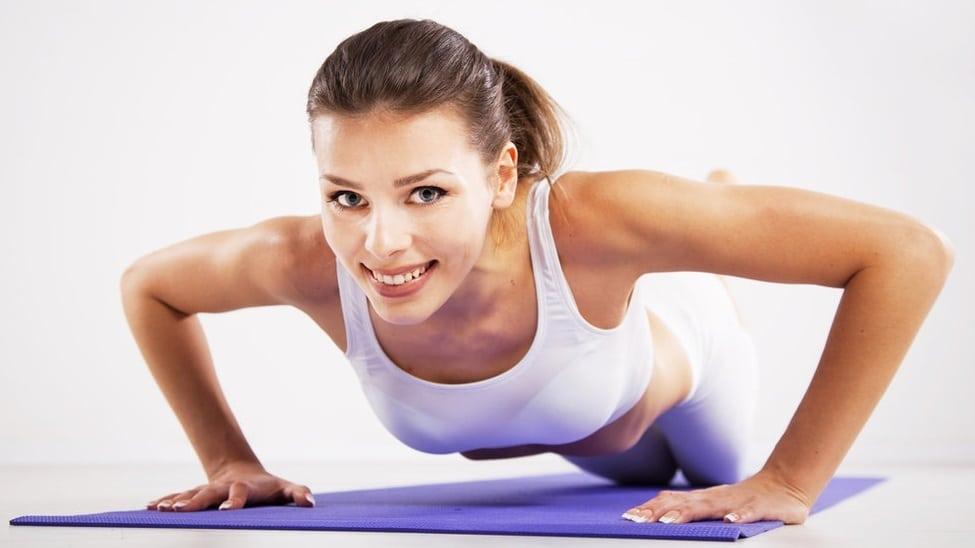 Руки и стопы нужно расположить на ширине плеч, пальцы развернуть вовнутрь, напрячь ягодицы и втянуть в живот. На два счета опустить корпус вниз, коснуться пола и вернуться в исходное положение. Выполнить два подхода по 8-10 повторений.