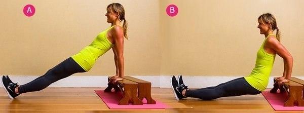 Для выполнения упражнения понадобиться устойчивый стул или столик. Нужно опереться ладонями о его поверхность, пальцы рук развернуть вовнутрь, стопы вытянуть вперед и на вдохе согнуть локти и опустить таз вниз. На выдохе вернуться в исходное положение. Желательно выполнять не менее трех подходов по 16 повторений в различном темпе.