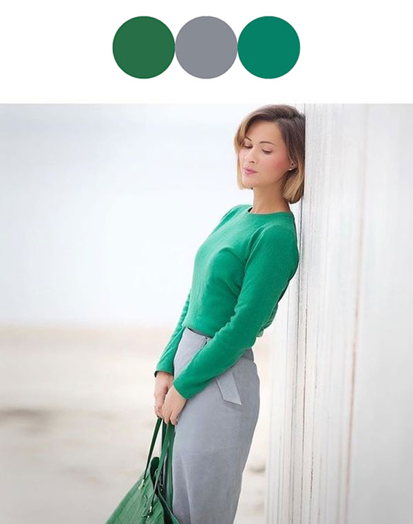 Серый цвет не будет выглядеть скучно, если скомбинировать его с оттенками зеленого. Этот цвет отлично подойдет для работы и будет выгодно смотреться со строгой юбкой оливкового цвета или шифоновой блузкой оттенка мяты.