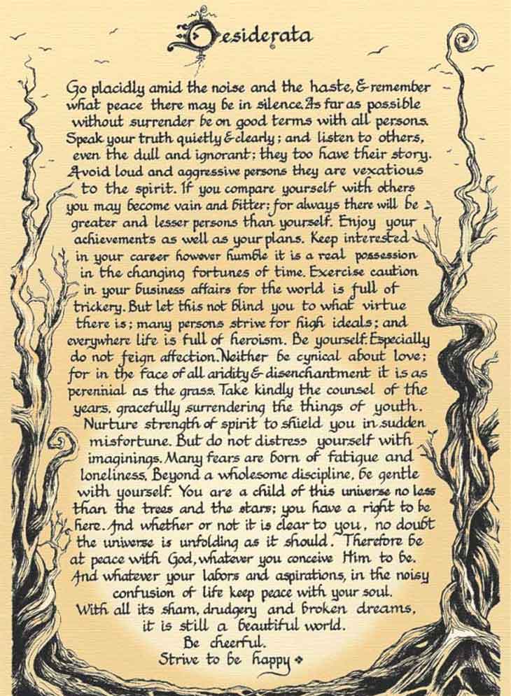 Подчиняйтесь здоровой дисциплине, но будьте мягким с собой. Вы — дитя мироздания не меньше, чем деревья и звезды: вы имеете право быть здесь. И пусть это для вас очевидно или нет, но мир идет так, как он и должен идти. Будьте в мире с Богом, как бы вы Его ни понимали.