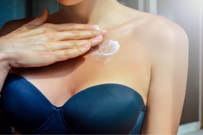 - Сделайте то же самое на другой груди. Затем обеими руками осторожно распределите крем по всей области декольте. Оно начинается с груди и заканчивается основанием шеи.