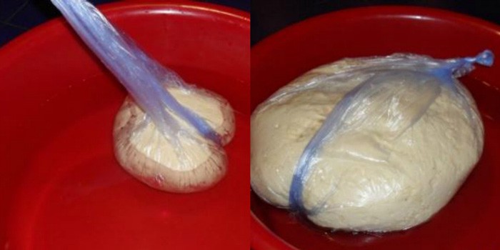 5. Смажьте внутренние стенки пакета подсолнечным маслом. Выложите тесто в пакет и плотно завяжите, таким образом, чтобы внутри было свободное пространство.