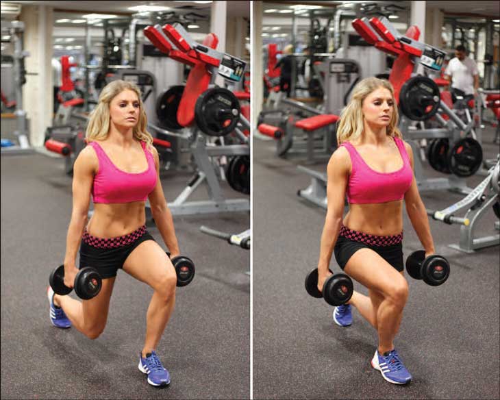 - Выпады являются разновидностью приседаний. Отличаются они лишь тем, что вся нагрузка в повторении приходится на одну ногу, а квадрицепс другого бедра испытывает растяжение. Таким упражнением эффективно завершать тренировку передней поверхности бедер.