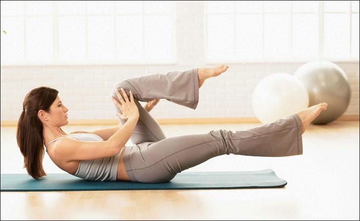 - Подтяни правое колено к себе и положи стопу на соседнее бедро. Наклонись к прямой ноге и задержись на 60 секунд. Поменяй ноги