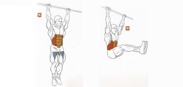 - Подъемы ног в висе. Лучшее упражнение для верхней и нижней части живота, но освоить его под силу людям со спортивным опытом. Необходимо взяться руками за перекладину и поднимать прямые ноги так, чтобы они создавали с корпусом 90 градусов. Новичкам можно практиковаться, подтягивая согнутые ноги. Оптимальное количество повторов 15 в три подхода.