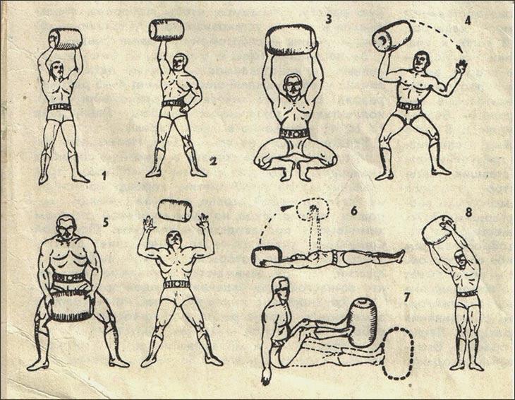 - Подъемов мешка с пола на грудь и жим над головой. Упражнение напоминает тяжелоатлетический толчок штанги, но без использования инерции.