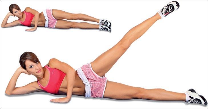 Лягте на бок. Зафиксируйте тело в устойчивом положении с помощью рук. Поднимите ногу вверх. После выполнения 12-15 повторений перевернитесь на другой бок и повторите движения для другой ноги
