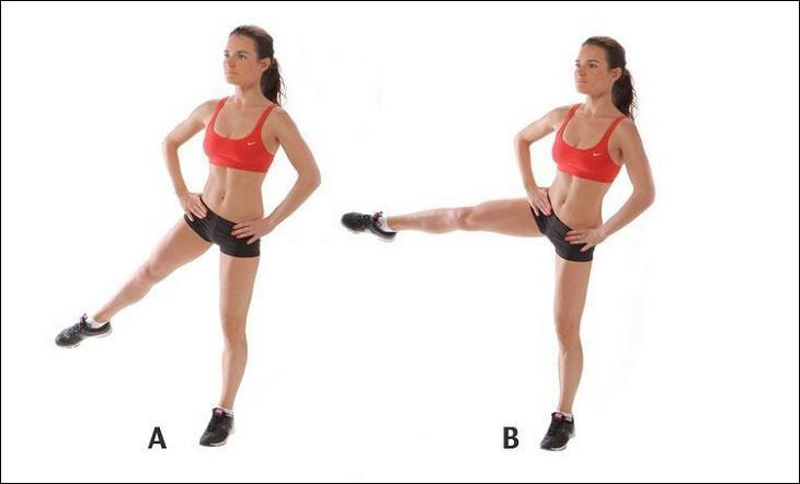Встаньте прямо и поместите руки на пояс. Медленно отведите одну ногу в сторону. Сделайте 12-15 повторений и поменяйте ногу