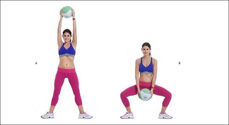 Поставьте ноги шире плеч и разведите носки в стороны. Приседая, держите спину ровной. Руки можно положить на пояс. Для дополнительного отягощения можно приседать с мячом или фитболом, поднимая его над головой